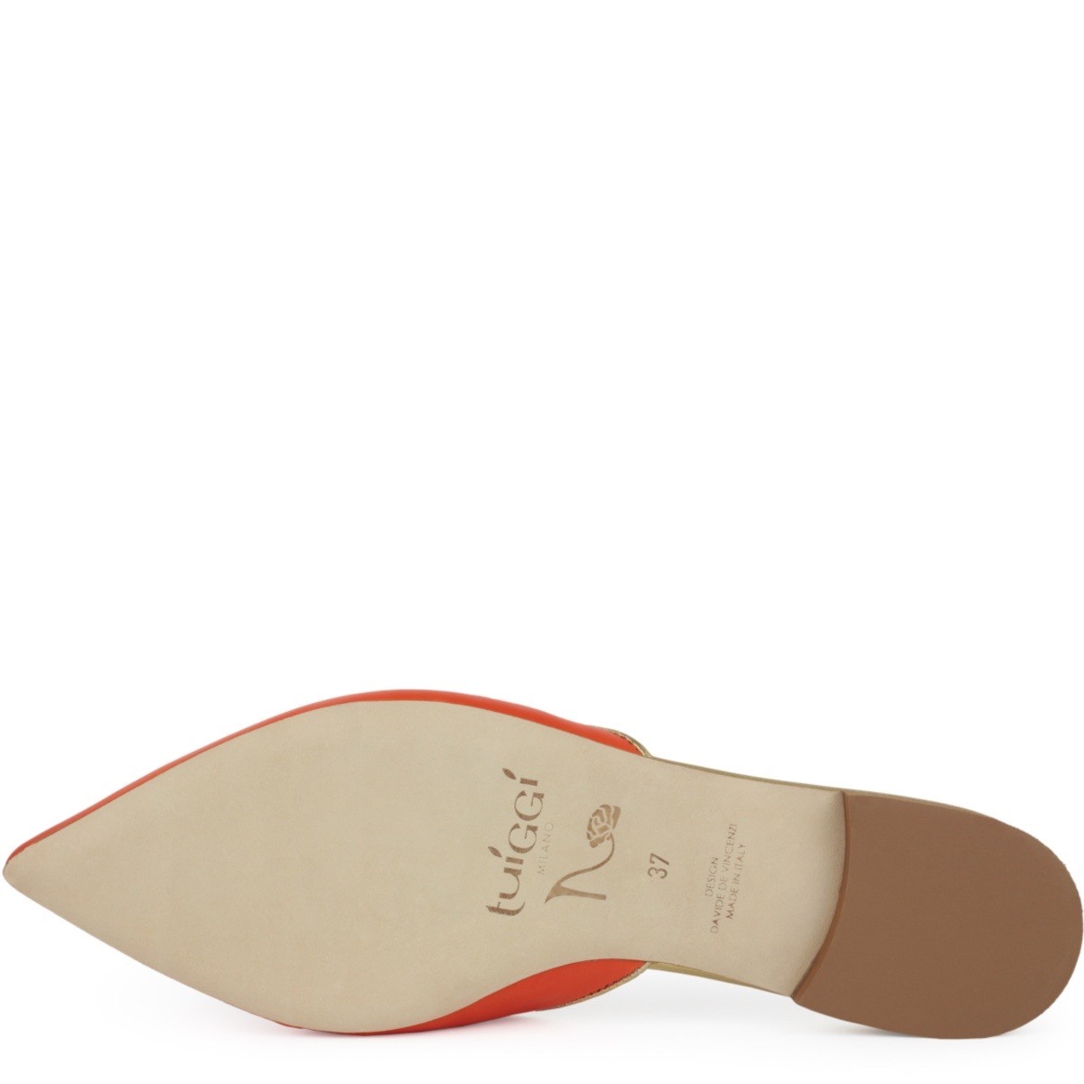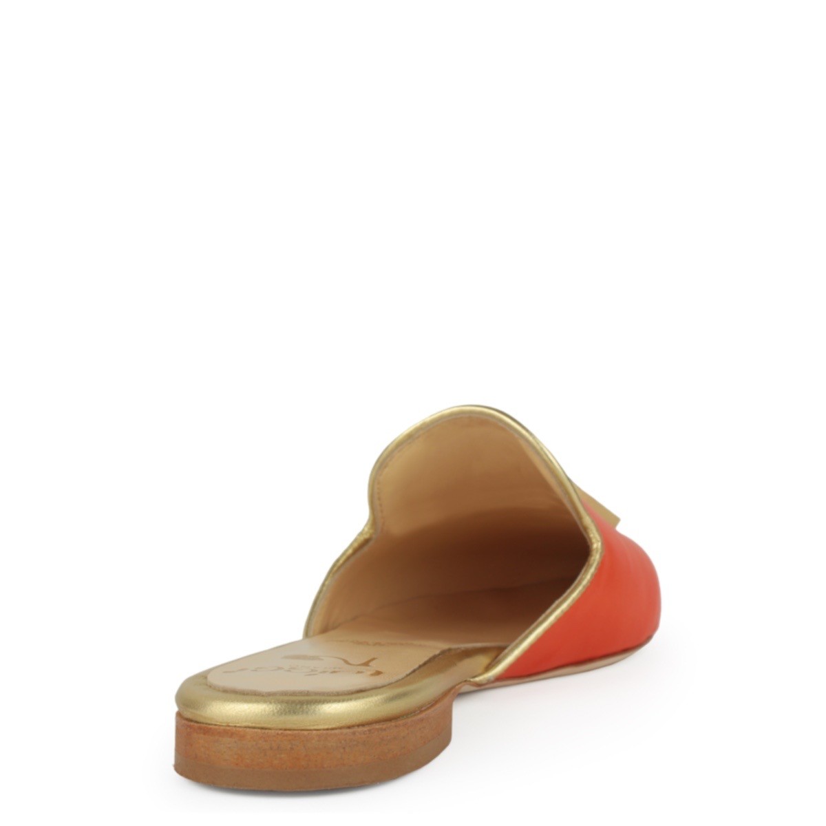 Pointed mules, in genuine orange nappa leather, with gold laminated leather tassels. Lining and insole are made of genuine leather.